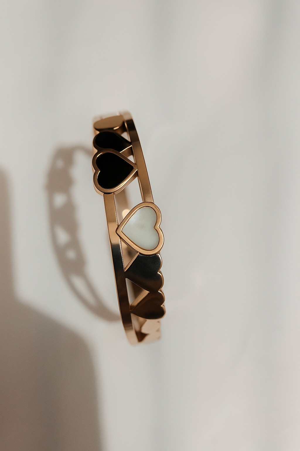 A stylish gold-plated bracelet featuring black and white dual-tone heart charms, perfect for daily wear, gifting, and modern fashion styling.