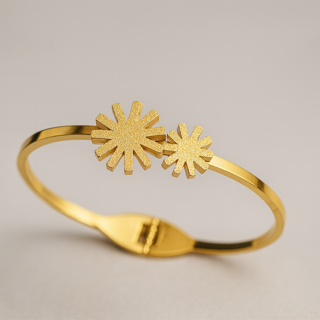 A modern gold-tone bracelet featuring two sparkling floral motifs with a matte-textured finish—perfect for daily wear, parties, and gifting.