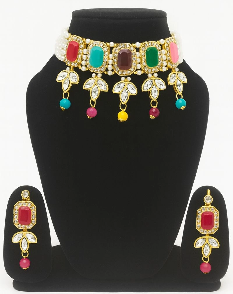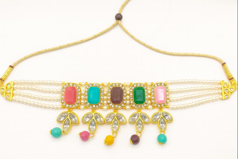 Traditional multicolor kundan choker necklace set adorned with pearls and colorful stone drops, perfect for weddings, festive wear, and ethnic occasions.