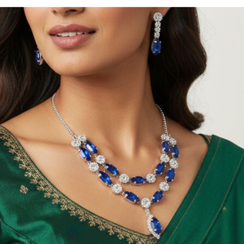 Discover timeless elegance with our Royal Blue Crystal Blossom Necklace Set, crafted to bring a luxurious sparkle to your special moments. This designer jewelry set features beautifully arranged marquise-cut blue stones, paired with premium crystal floral motifs that reflect light from every angle.
