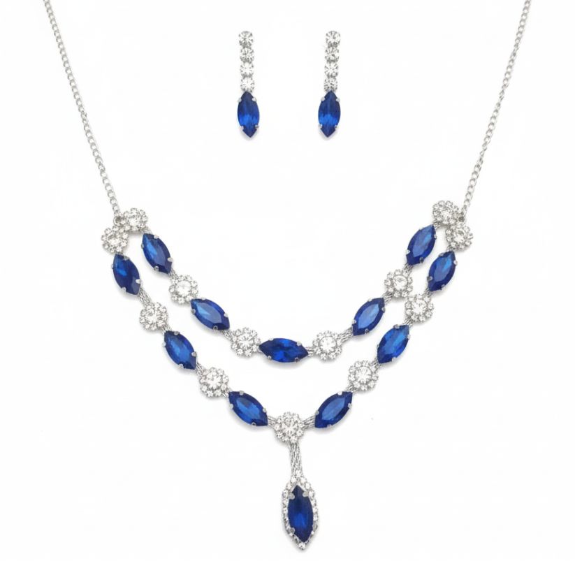 Elevate your style with the Royal Blue Crystal Blossom Necklace Set, featuring sparkling marquise-cut blue stones and shimmering crystal floral accents. Perfect for weddings, parties, and festive outfits, this elegant necklace and matching earrings add a touch of royal glamour to any look.