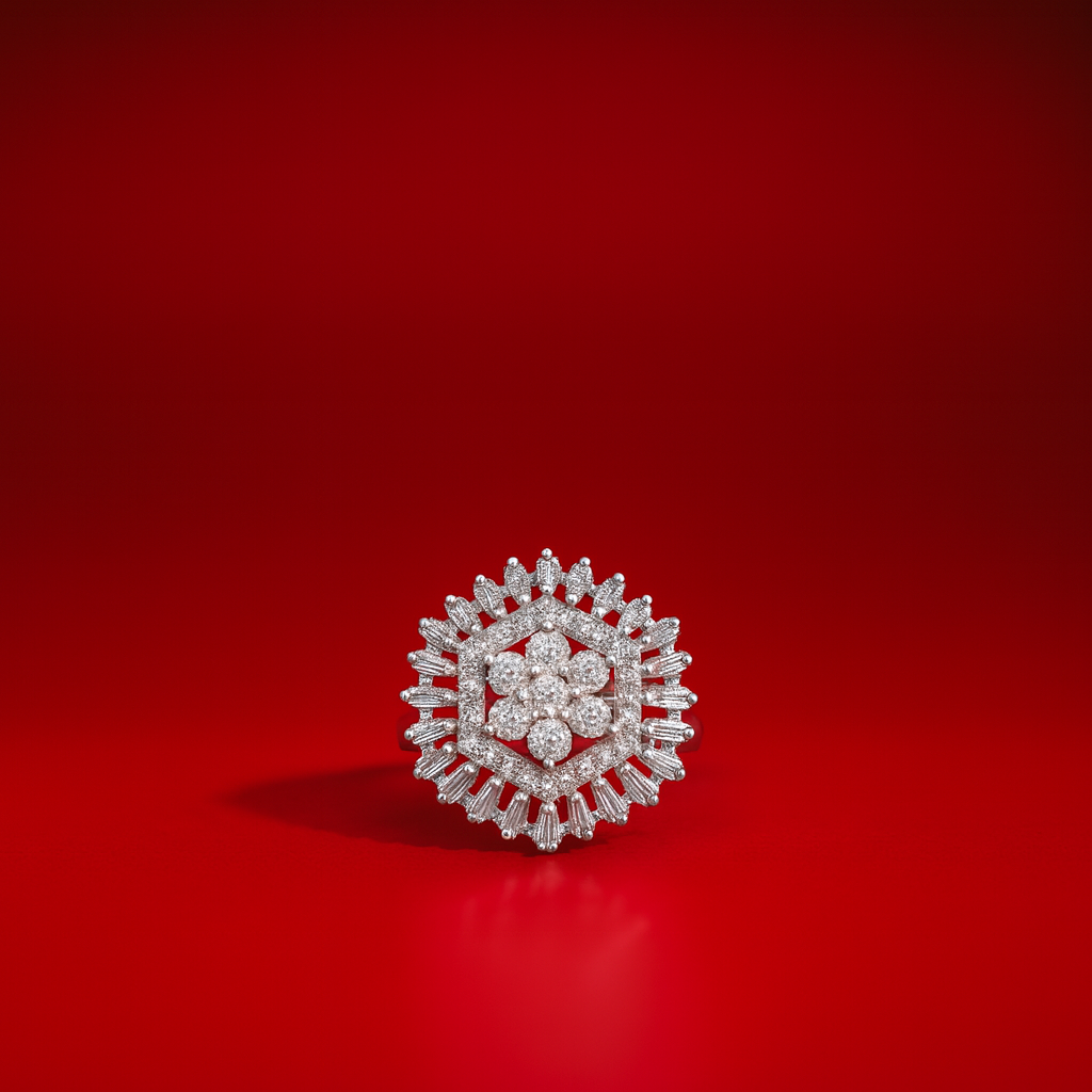 A luxurious diamond-look statement ring featuring a floral center with hexa-shaped baguette detailing—perfect for parties, weddings, and premium festive styling.